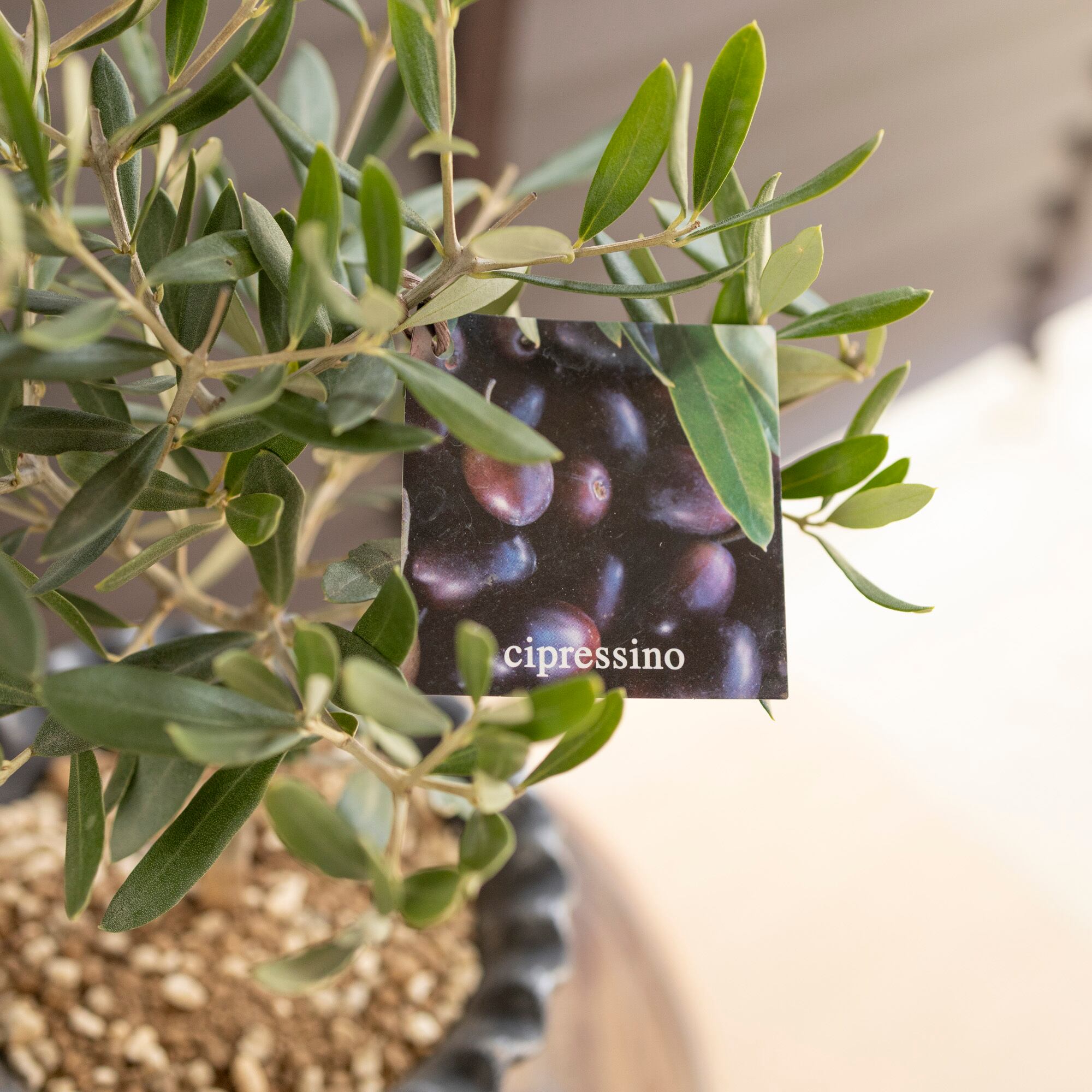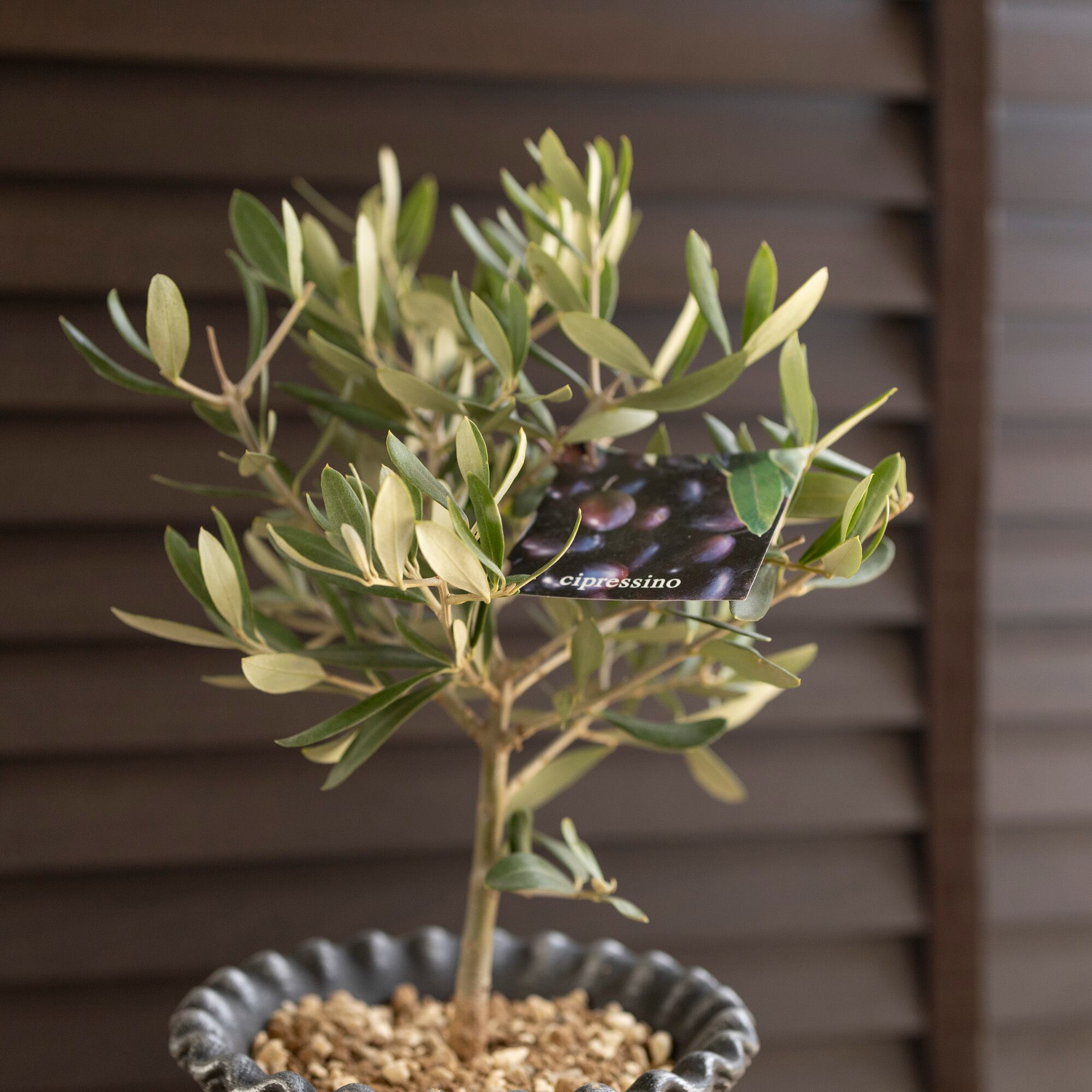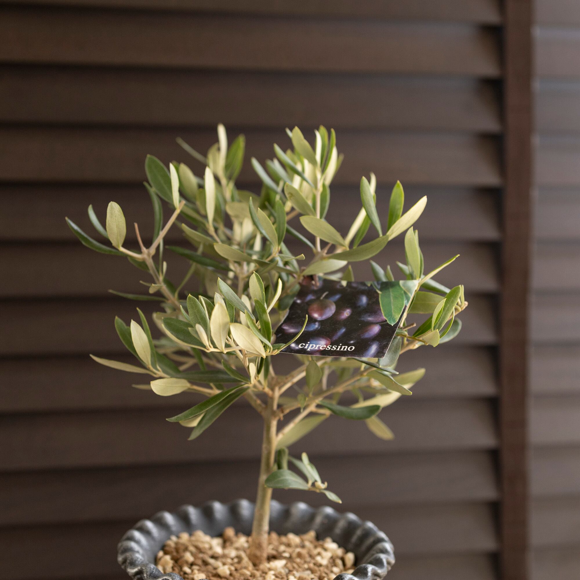 シプレッシーノ(Cipressino)は、イタリア原産のオリーブの品種で、太い幹が伸びコンパクトに樹形がまとまりやすい。