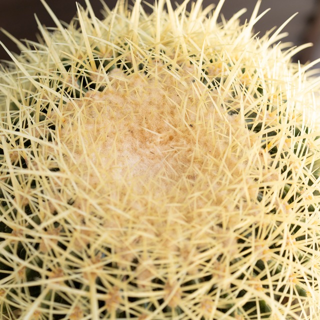 Echinocactus grusoniiという名の品種で黄金色の鋭いトゲで覆われているのが特徴的。