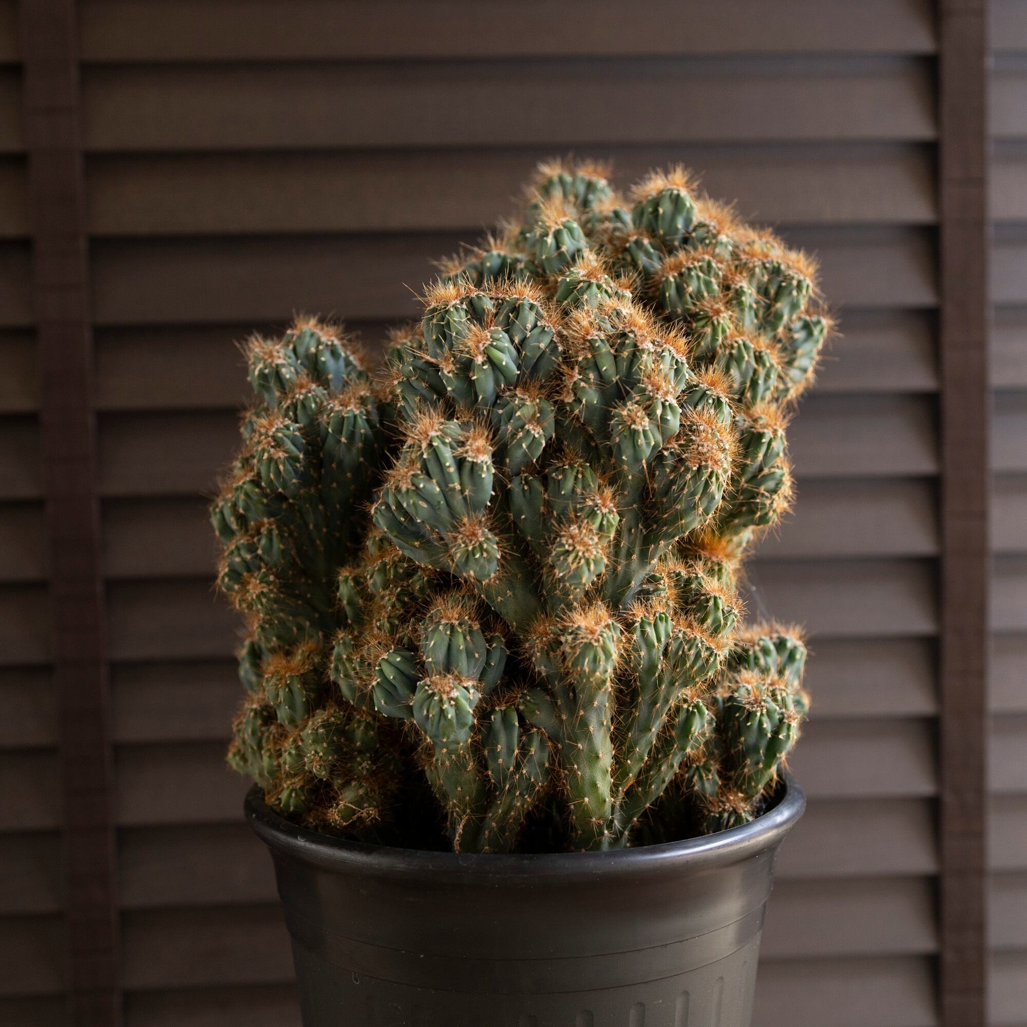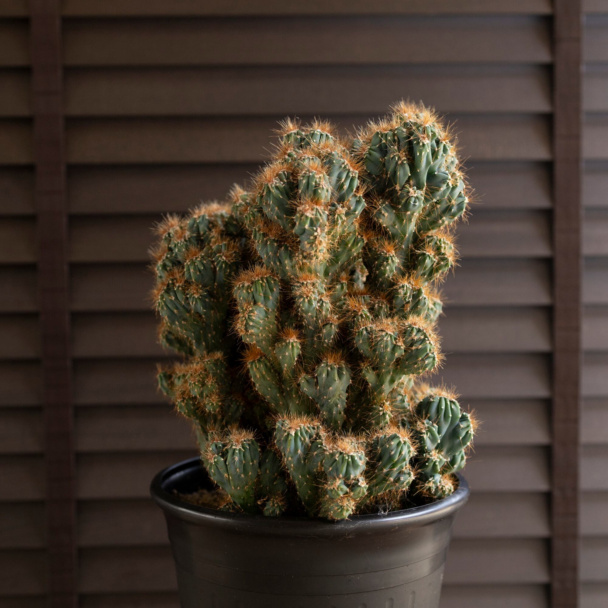 金獅子サボテンは、成長点が綴化し、彫刻のように、不規則に連なるフォルムを持つ柱サボテンです。