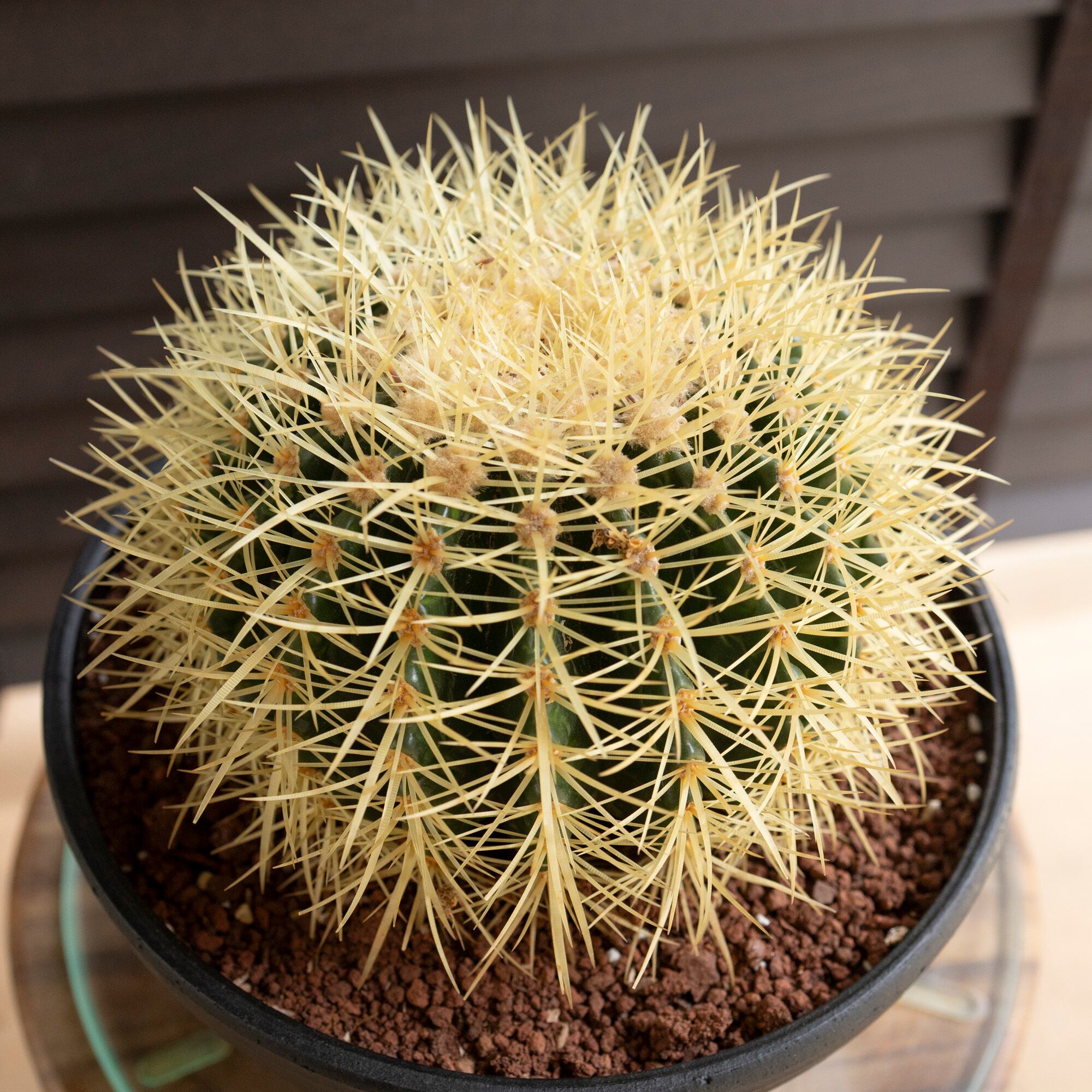 Echinocactus grusoniiという名の品種で黄金色の鋭いトゲで覆われているのが特徴的。