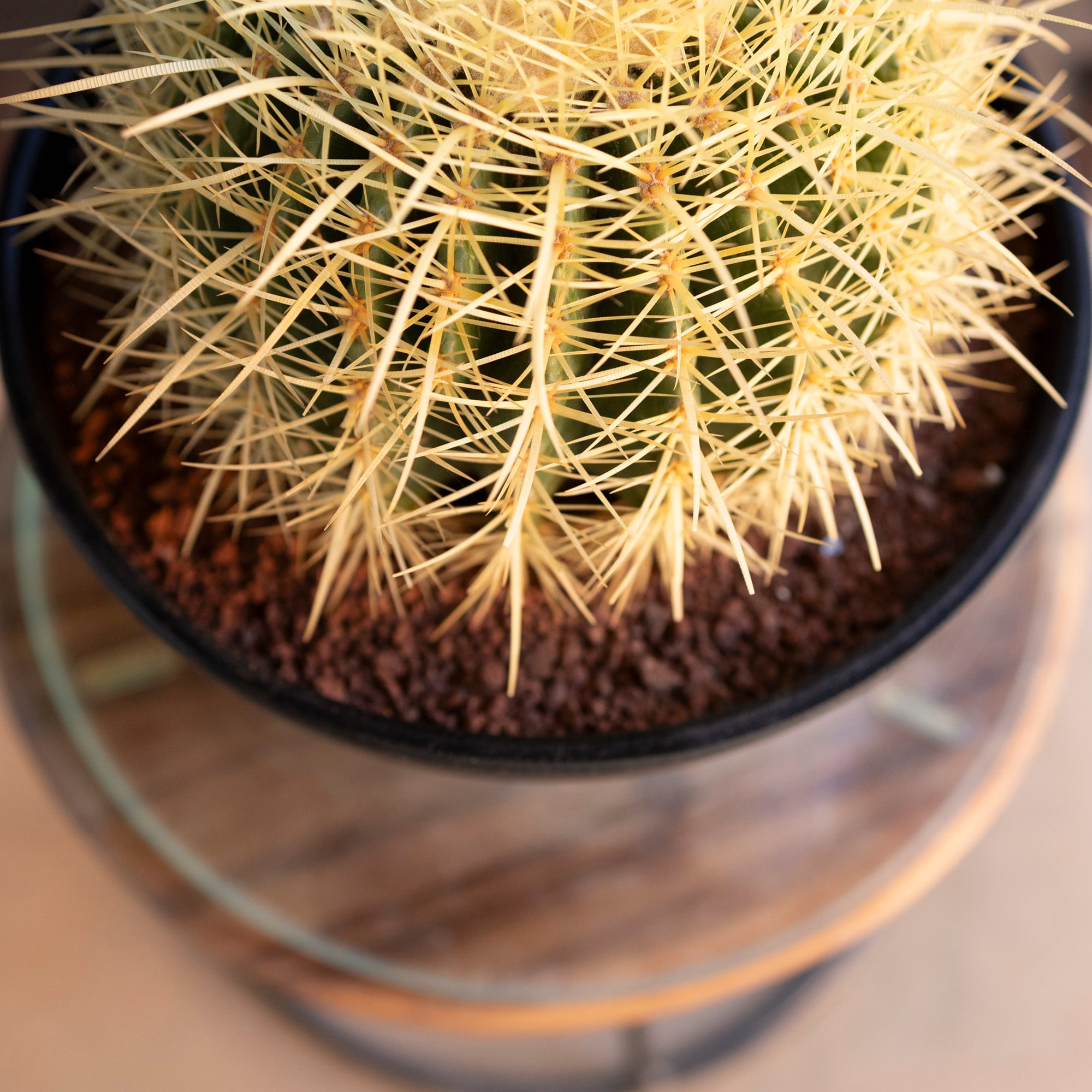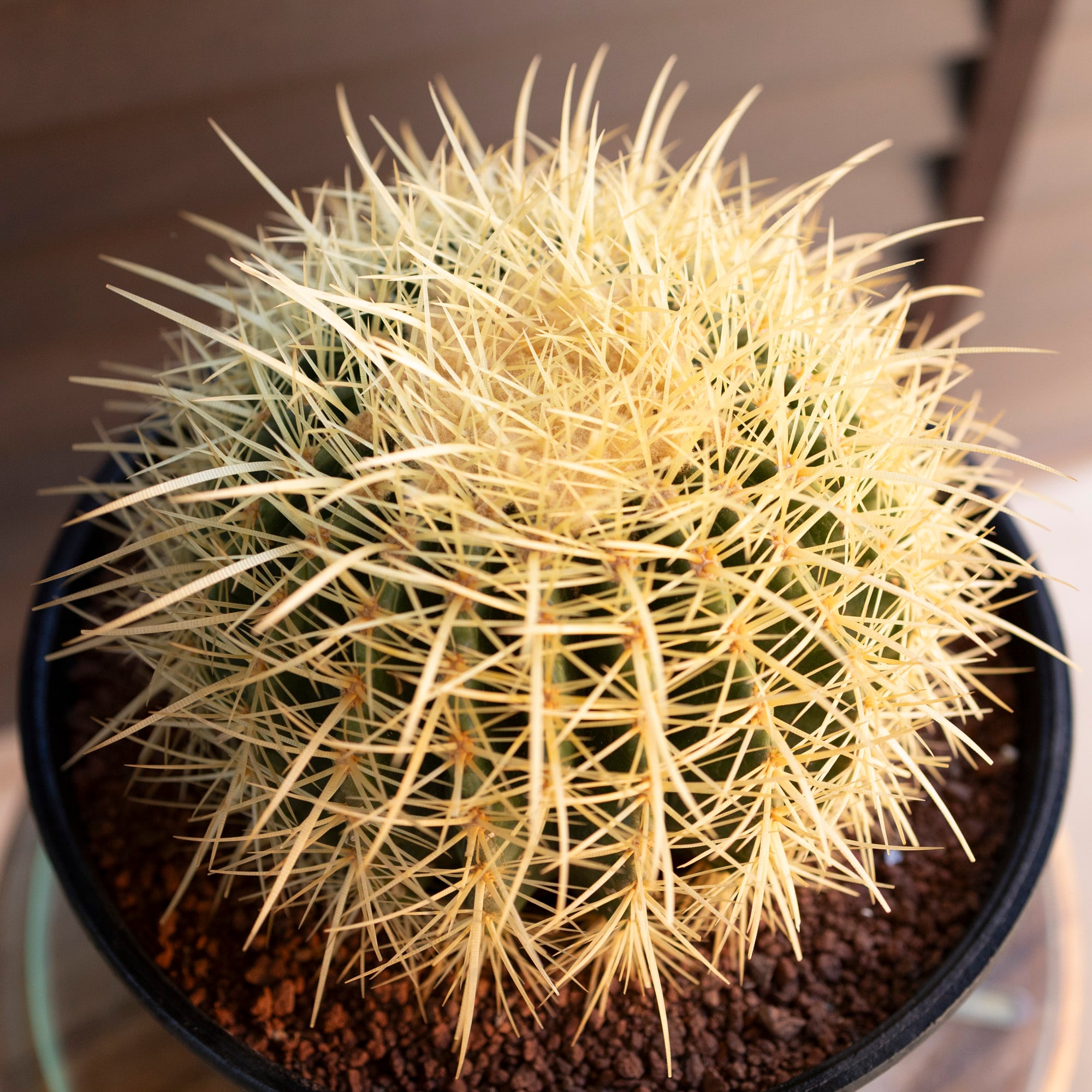 Echinocactus grusoniiという名の品種で黄金色の鋭いトゲで覆われているのが特徴的。