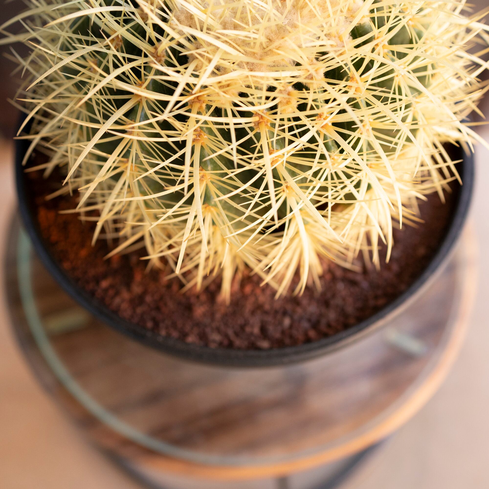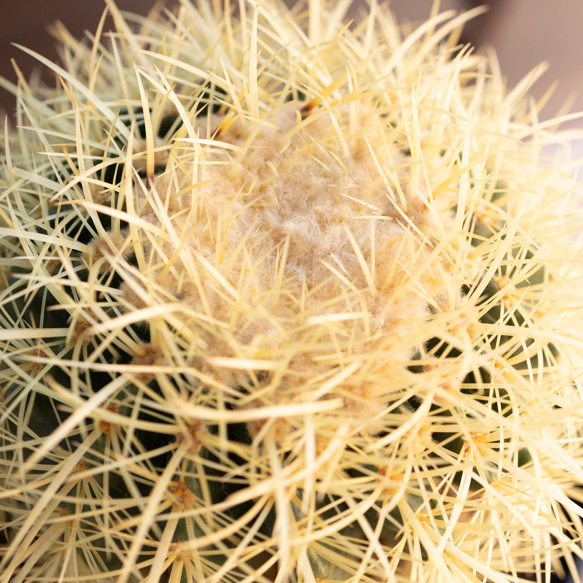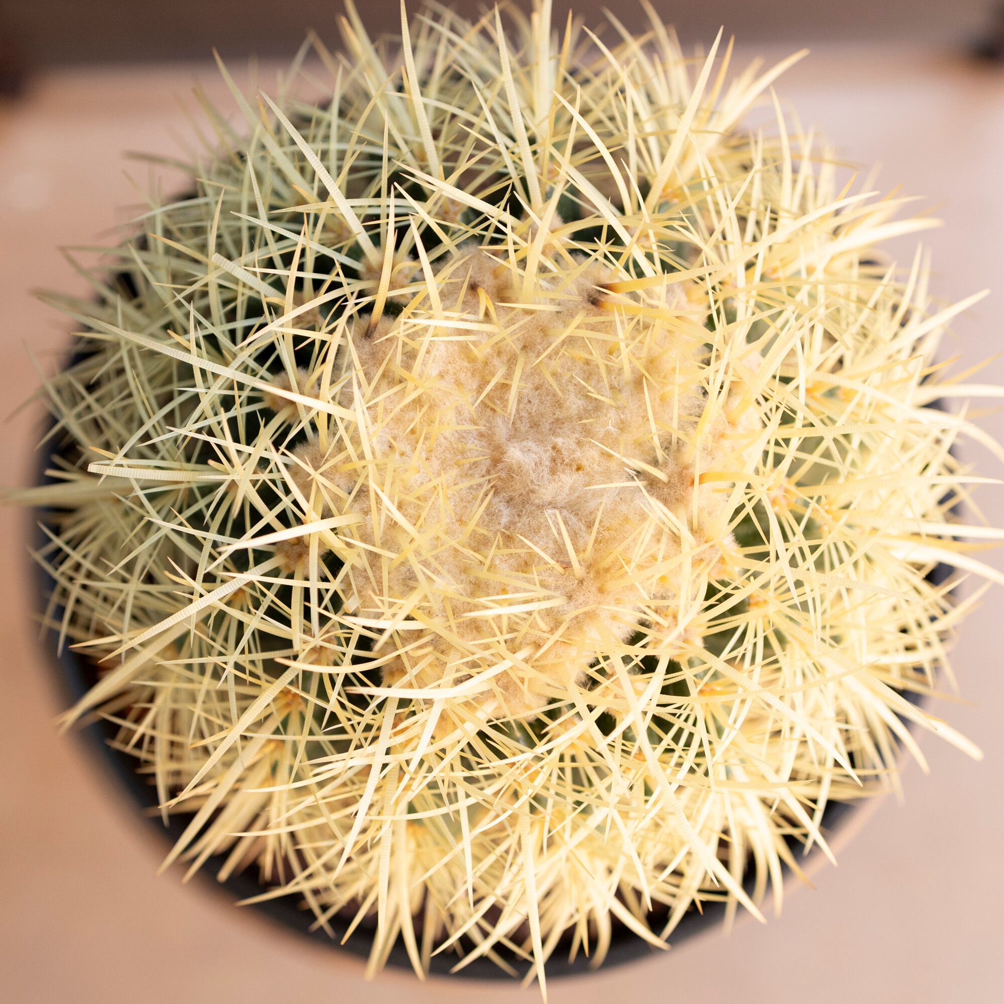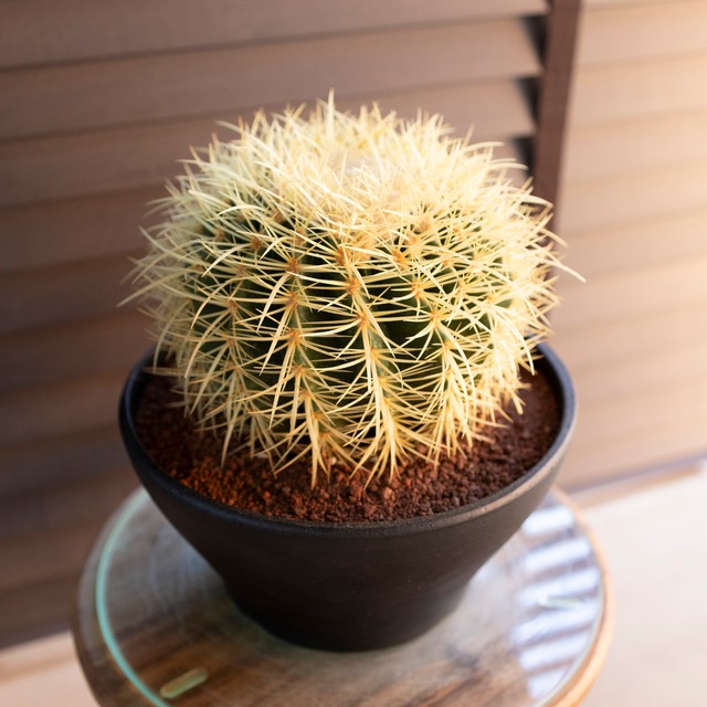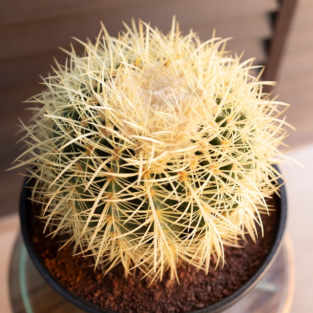 Echinocactus grusoniiという名の品種で黄金色の鋭いトゲで覆われているのが特徴的。
