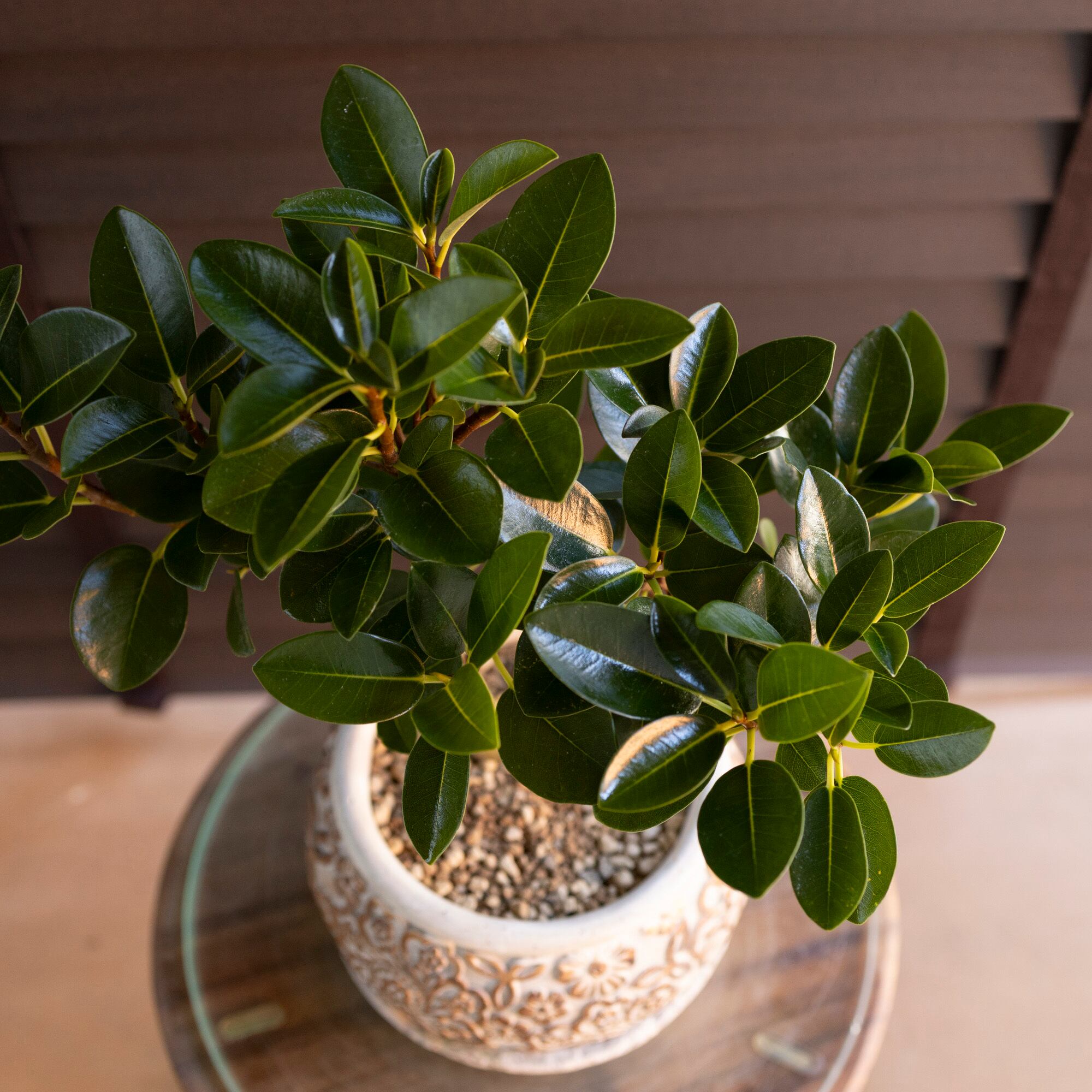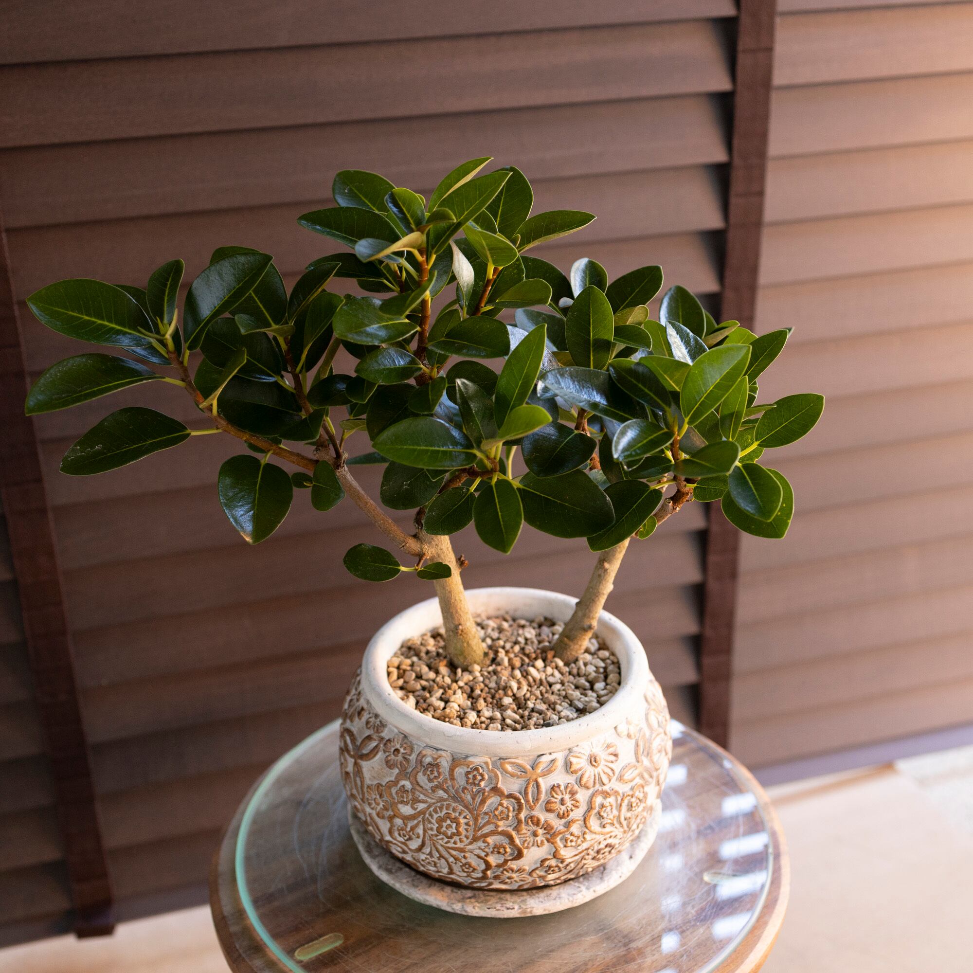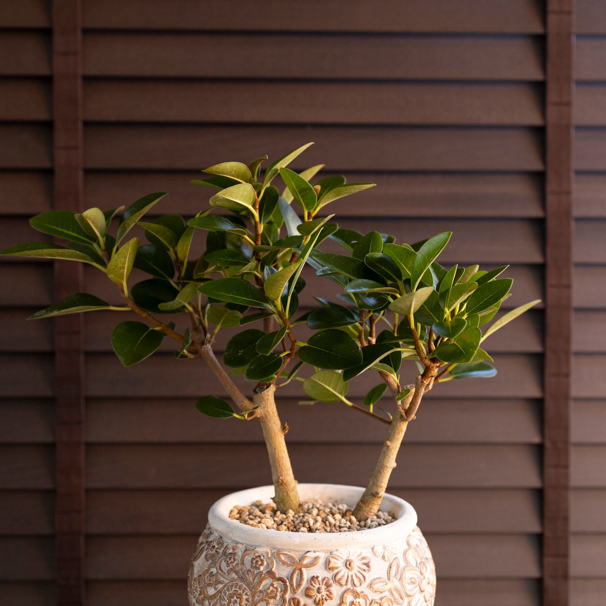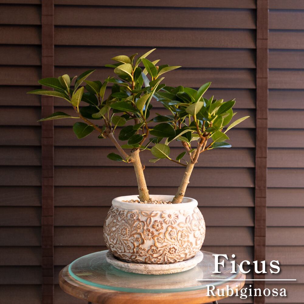 幹太 フィカス ルビギノーサ 盆栽仕立て フランスゴムの木 Rubiginosa 5号 陶器鉢 観葉植物 ゴムの木 0118WG
