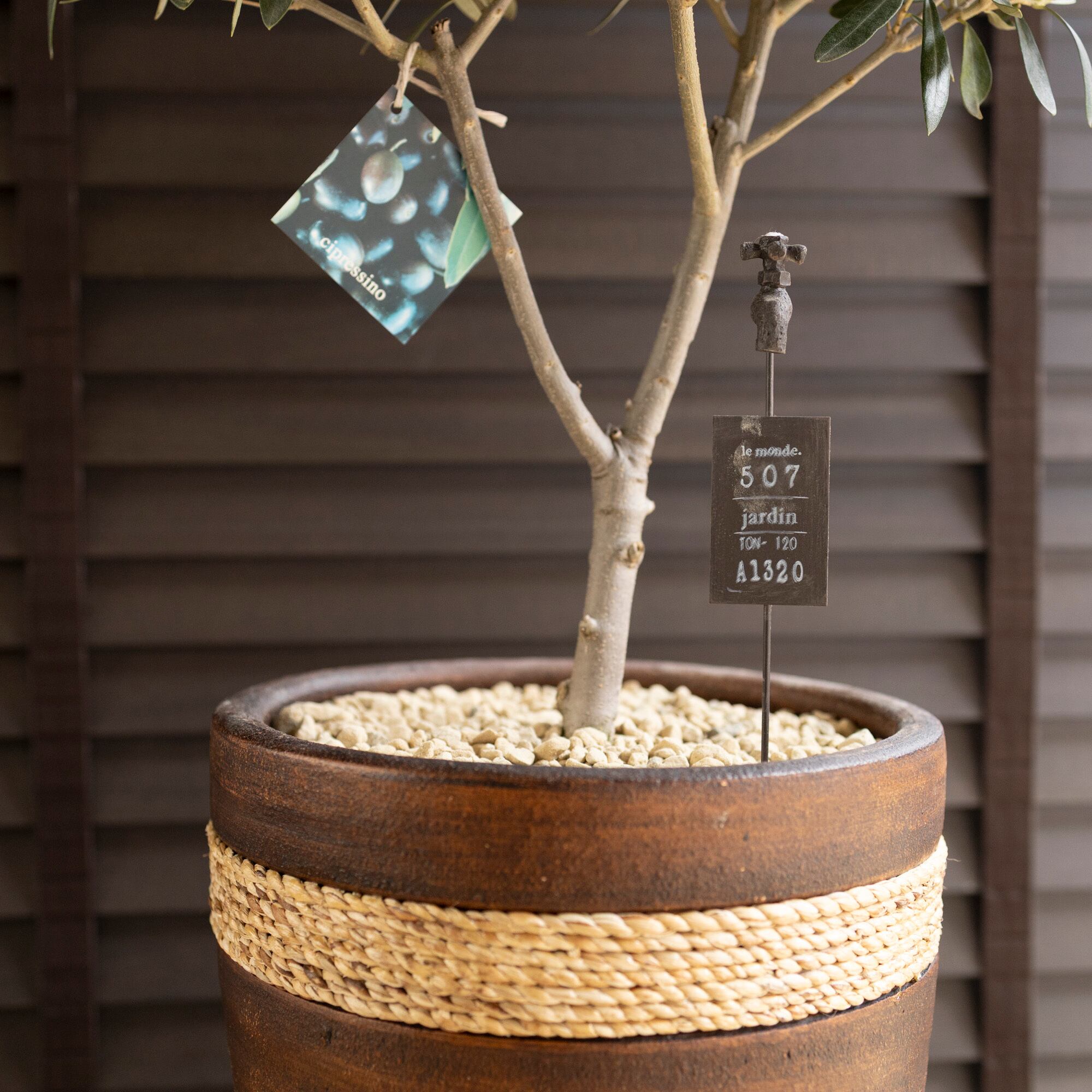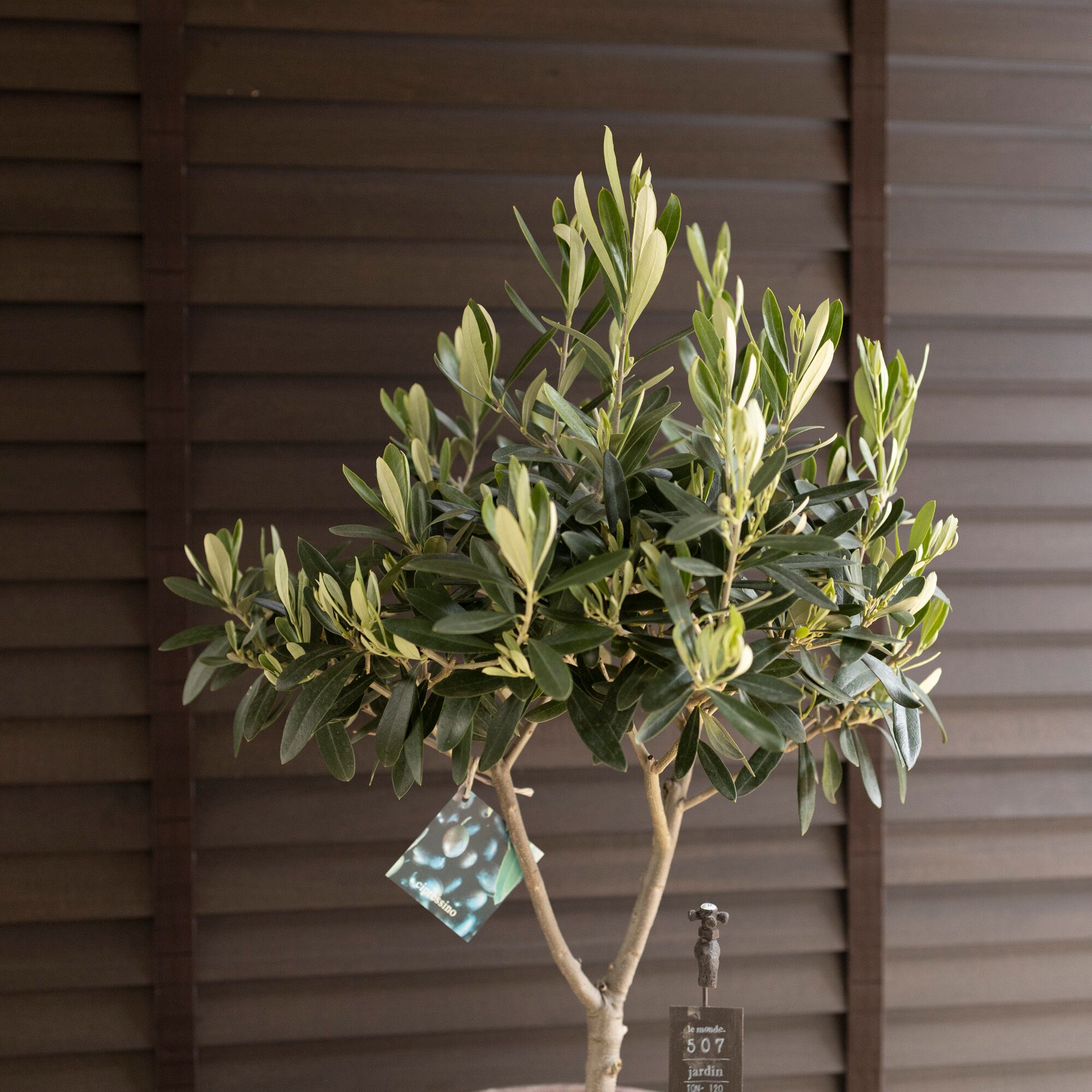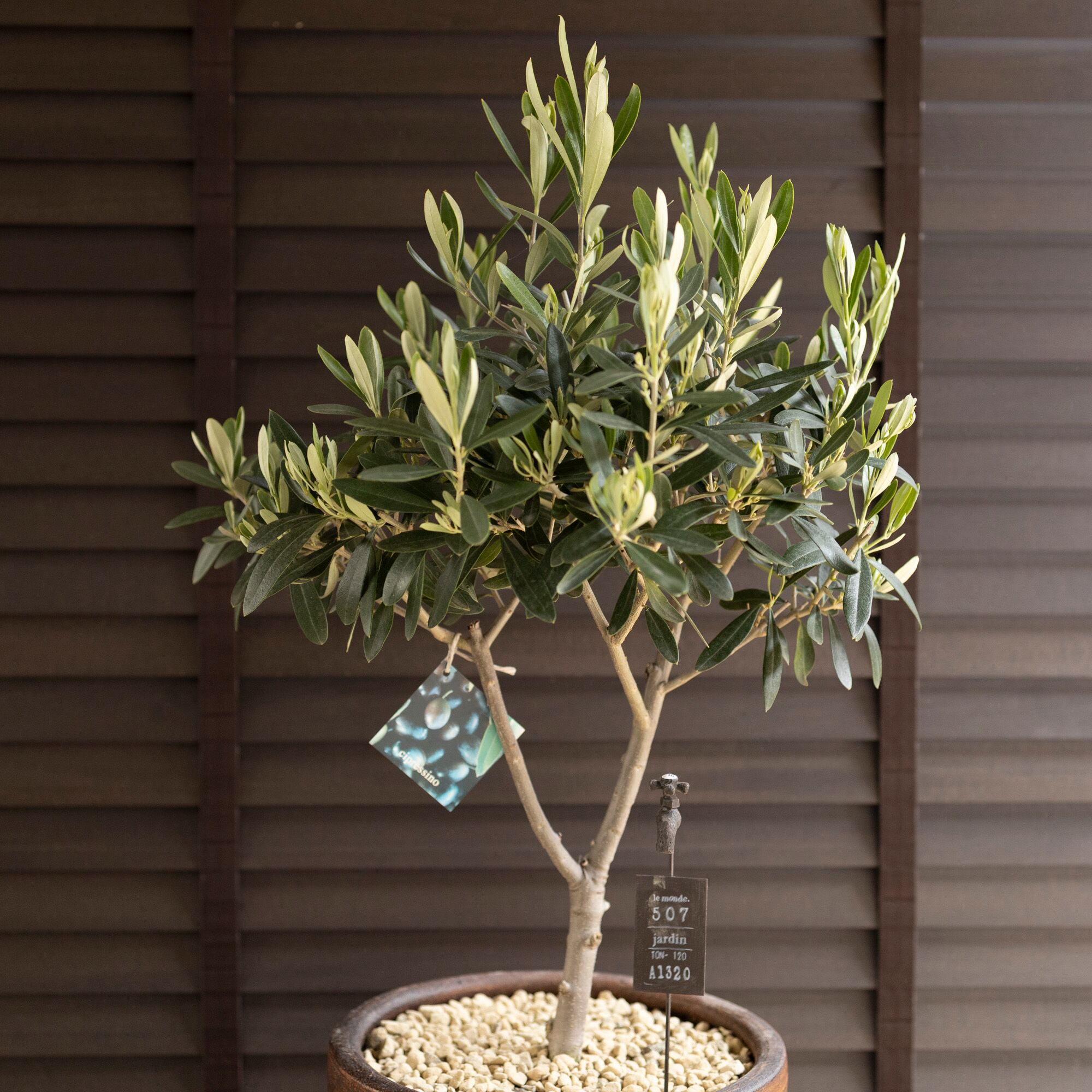 シプレッシーノ(Cipressino)は、イタリア原産のオリーブの品種で、太い幹が伸びコンパクトに樹形がまとまりやすい。