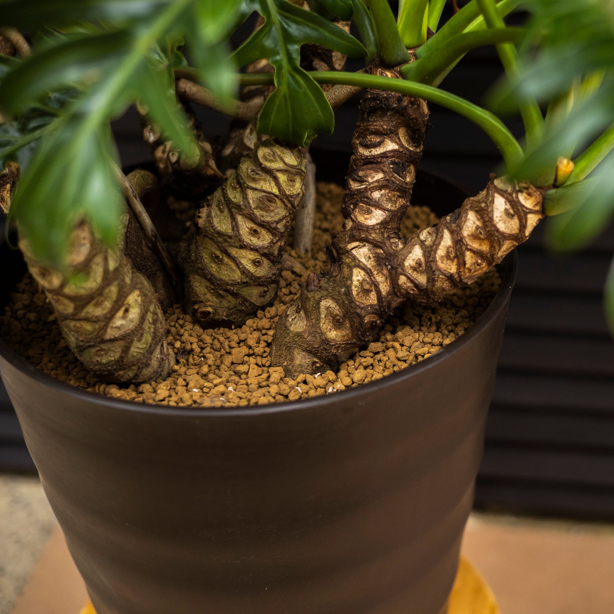 サトイモ科の植物は根回りがよく大きく育っていく過程で土の表面から根っこが飛び出して迫力のある姿へと変化していきます。