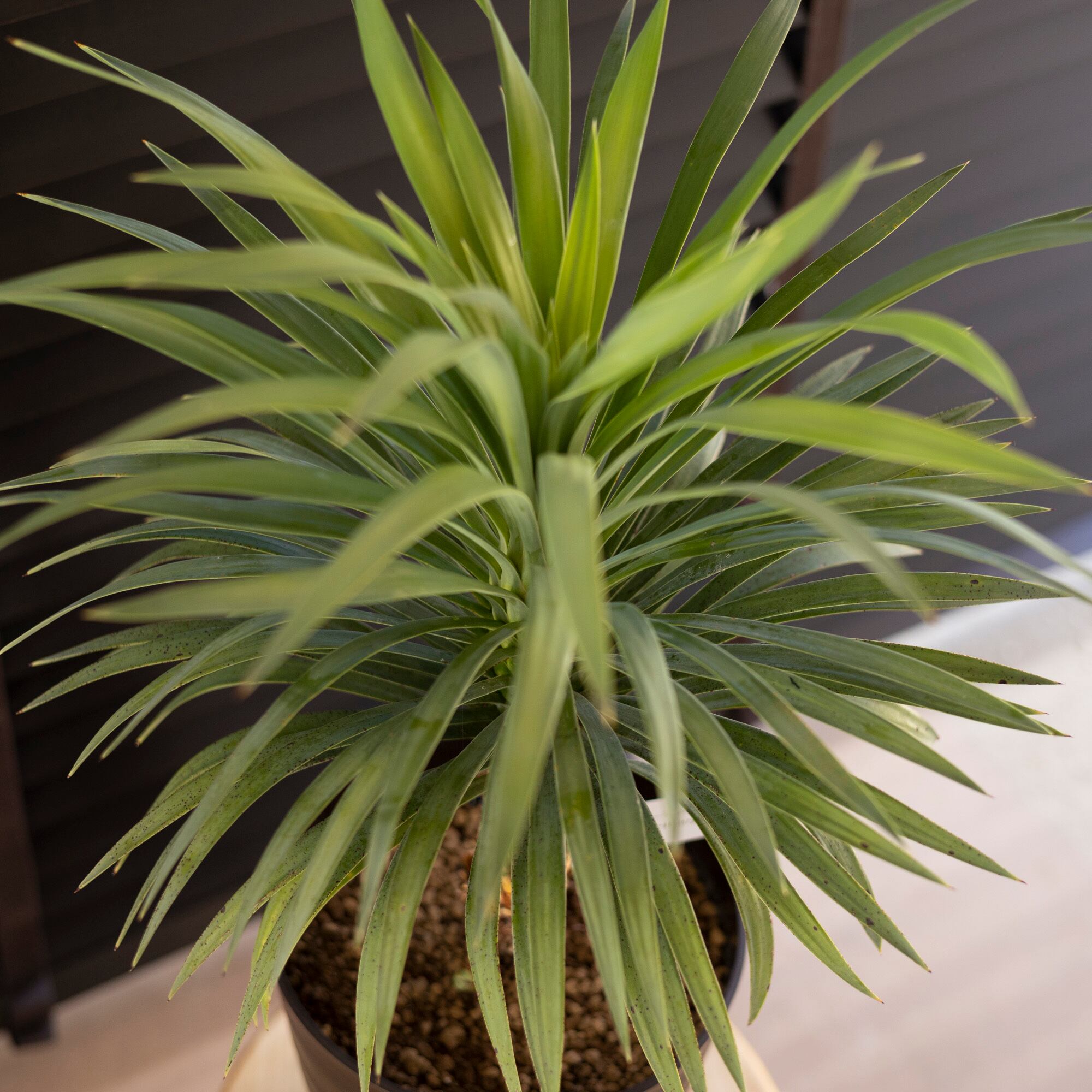 放射状に垂れ下がる青みを帯びた葉が美しく、寒さにあたると段々と葉が赤みを帯びます。