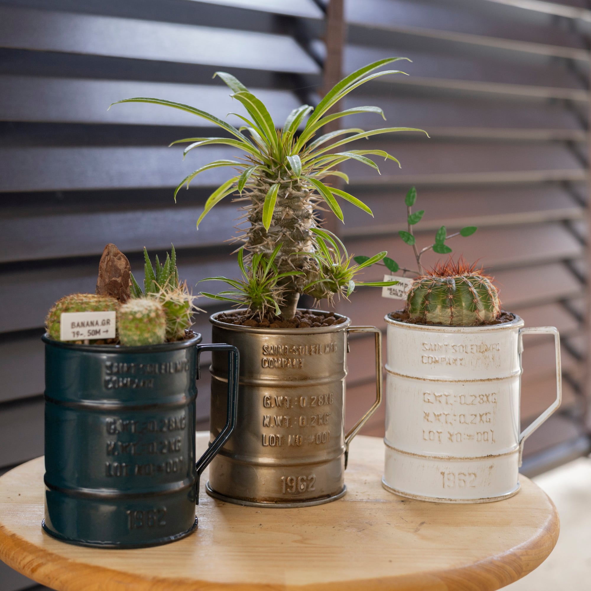 ジョッキ型の空き缶ポットにミニサボテンを寄せ植えし、かわいい雰囲気に仕上がりました。ベランダや部屋の窓際くとお部屋の雰囲気がガラッと変わります。