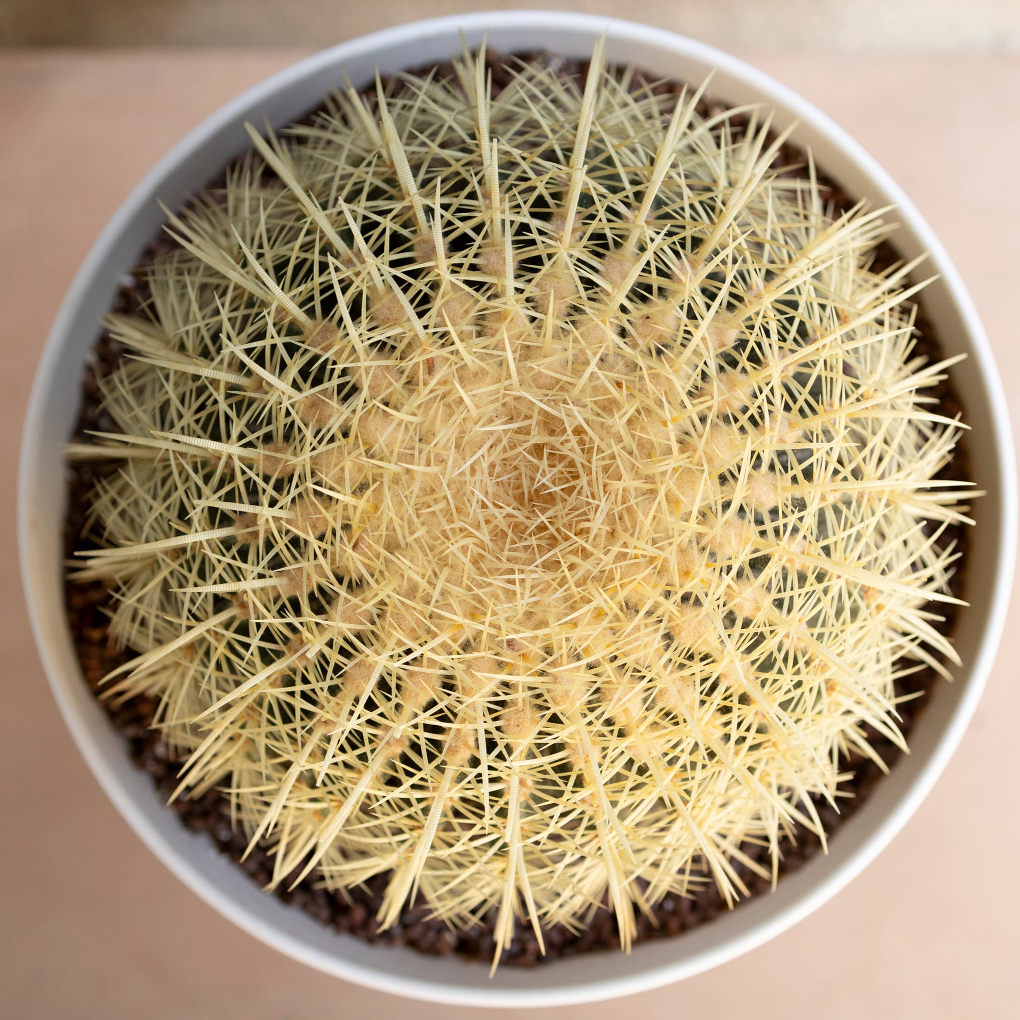 Echinocactus grusoniiという名の品種で黄金色の鋭いトゲで覆われているのが特徴的。