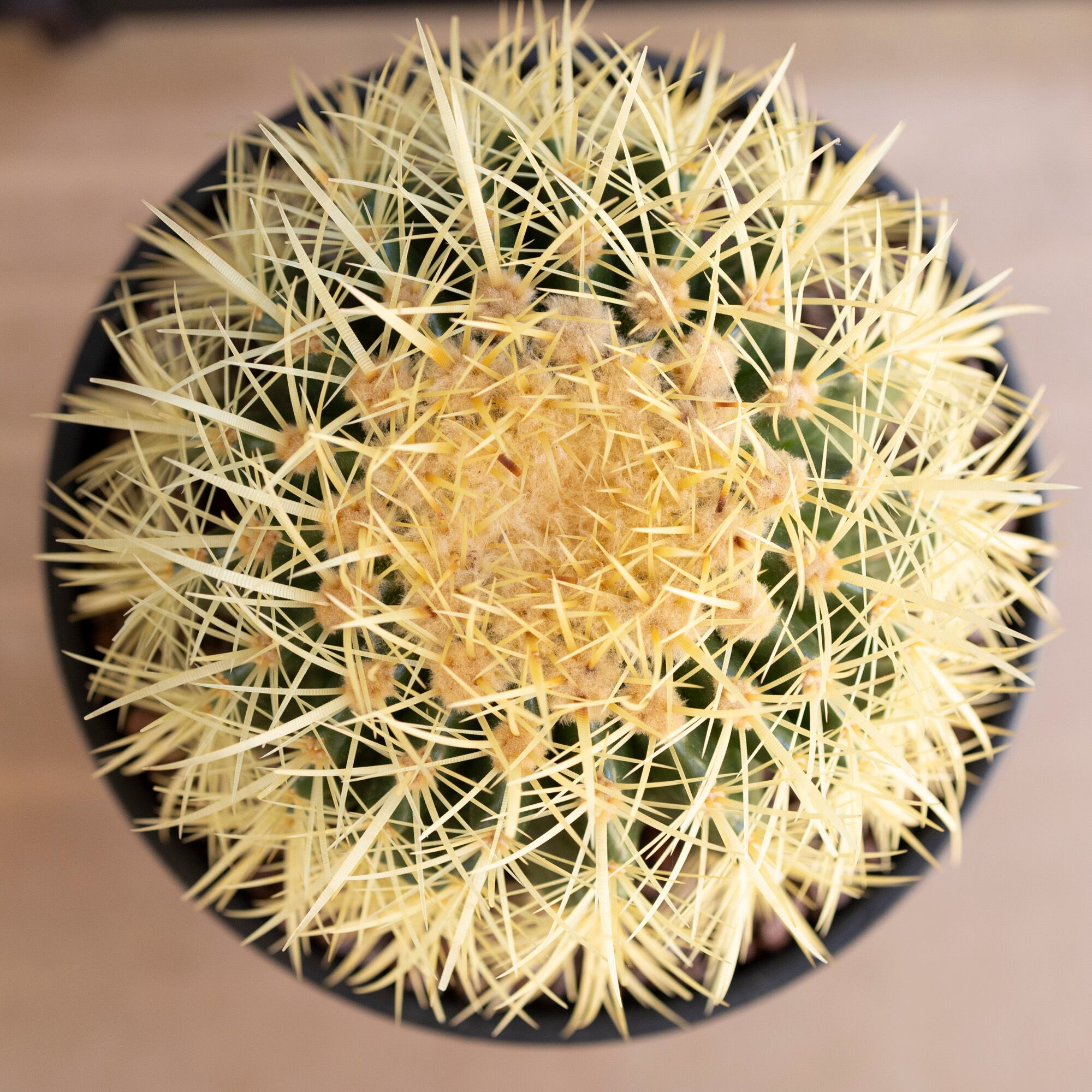 Echinocactus grusoniiという名の品種で黄金色の鋭いトゲで覆われているのが特徴的。