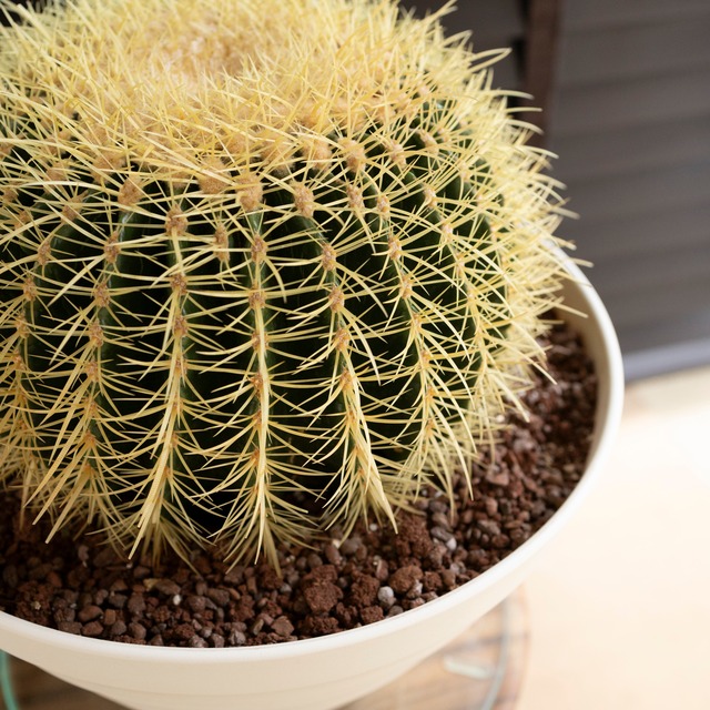 Echinocactus grusoniiという名の品種で黄金色の鋭いトゲで覆われているのが特徴的。