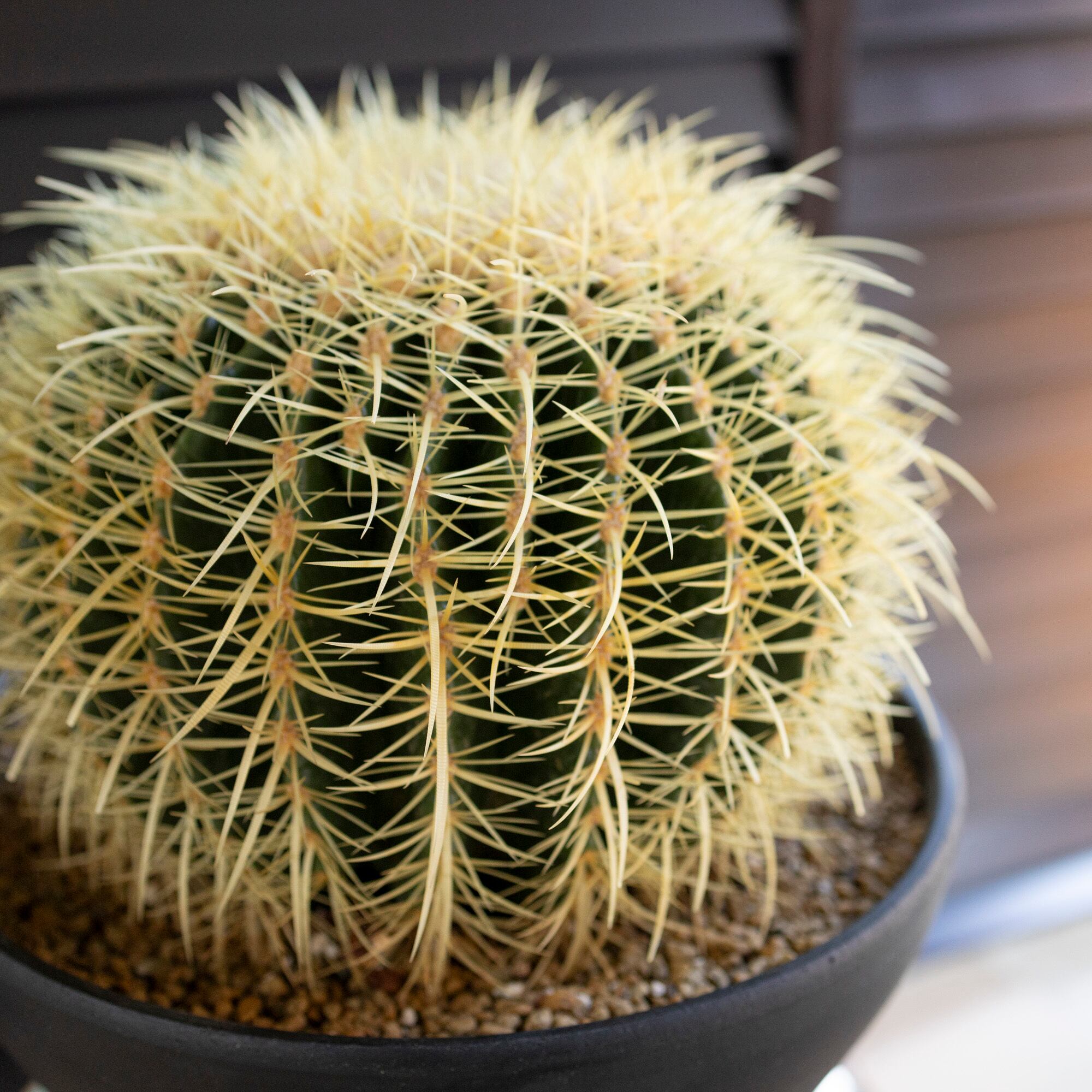 Echinocactus grusoniiという名の品種で黄金色の鋭いトゲで覆われているのが特徴的。