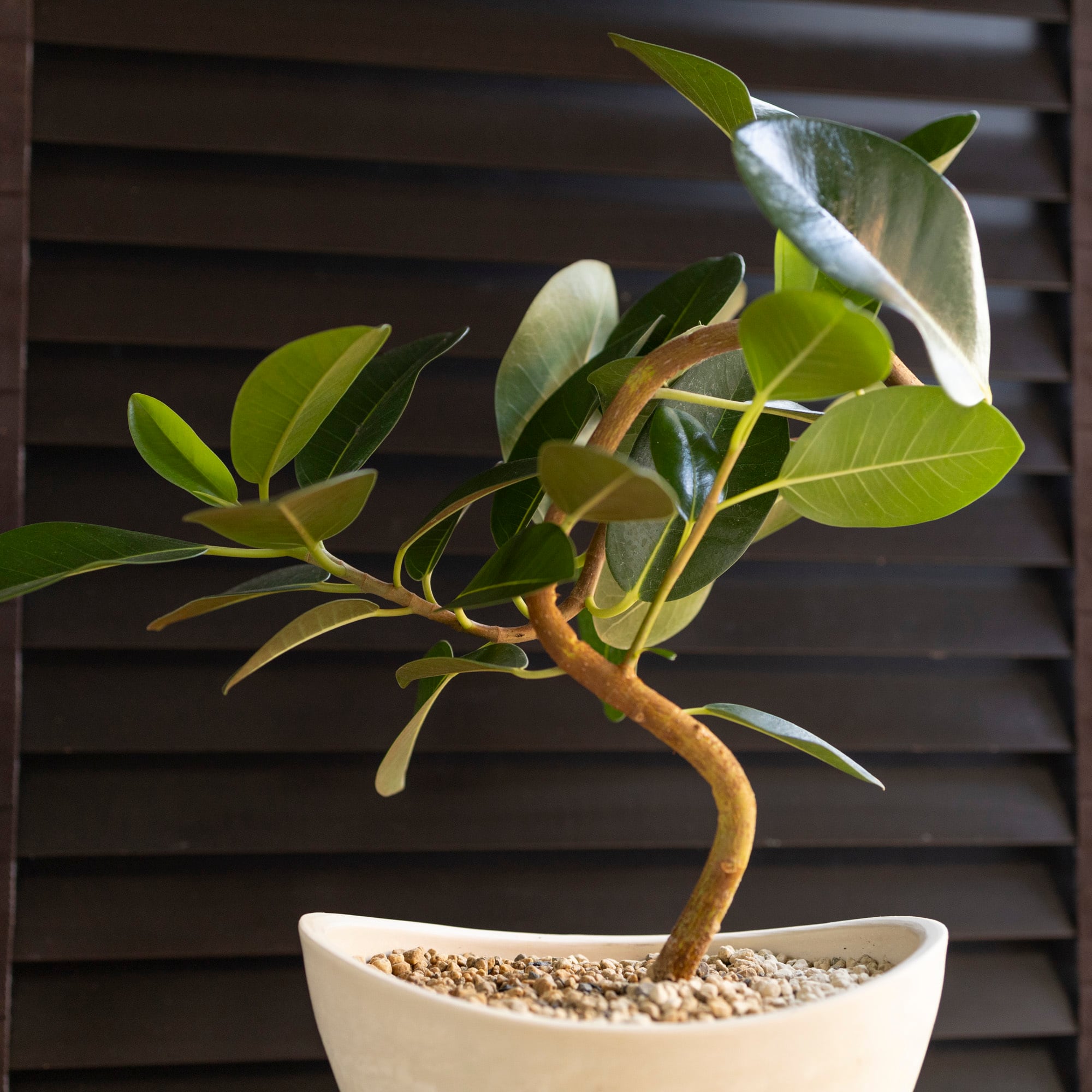 曲げ仕立てで綺麗な幹肌が魅力的です。肉厚で光沢の美しい状態を保つためには、室内のよく日が当たる場所で管理して下さい。